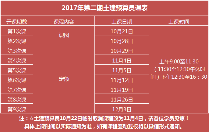因十九大原因我校土建预算员原定于10月22日的的课程临时取消改为11月4日,其他课程时间及内容不变,课程时间另行通知。